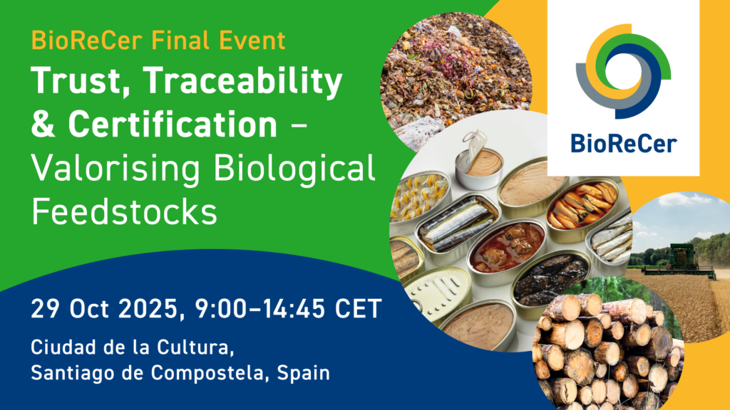 On 29 October 2025, the BioReCer project invites stakeholder from the bio-based industries, research, certification and standardisation, and (consumer) organisations to its final event at the Ciudad de la Cultura in Santiago de Compostela, Spain. Scheduled from 9:00 to 14:45 CET, this occasion marks the conclusion of the EU‑funded project, which over three years has worked intensely to improve the trust, traceability, and certification of biological feedstocks.