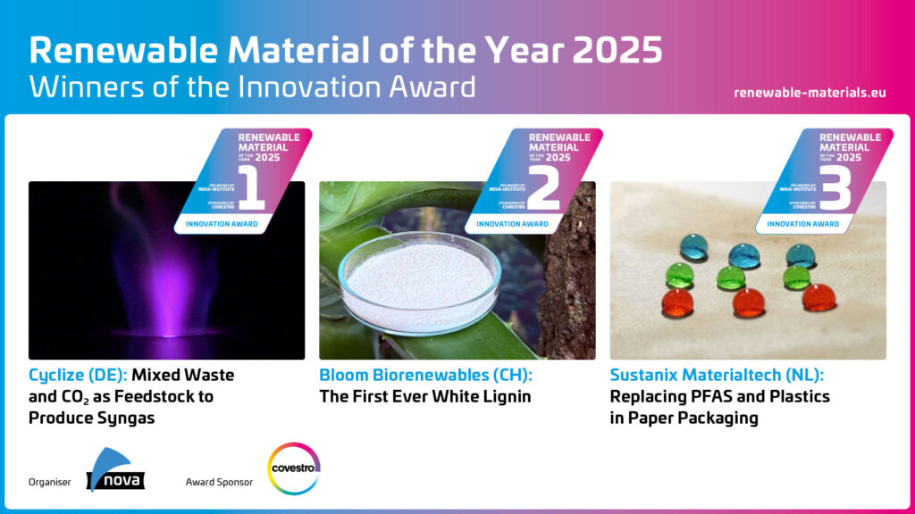 The nova-Institute would like to thank UPM Biochemicals (FI) for supporting the conference as Platin Sponsor, CO2Value Europe (EU), IFF (US), Leaf Biotech (CN), RedCert (DE), TÜV AUSTRIA Belgium (BE), Uncountable Inc.(US), and Zhongke Guosheng (Hangzhou) Technology (CN) as Gold Sponsors, and J. Rettenmaier & Soehne GmbH + Co KG (DE) as Silver Sponsor. Thank you also to TNO (NL) for acting as Get-Together Session sponsor. The innovation award “Renewable Material of the Year 2025” was sponsored by Covestro (DE).