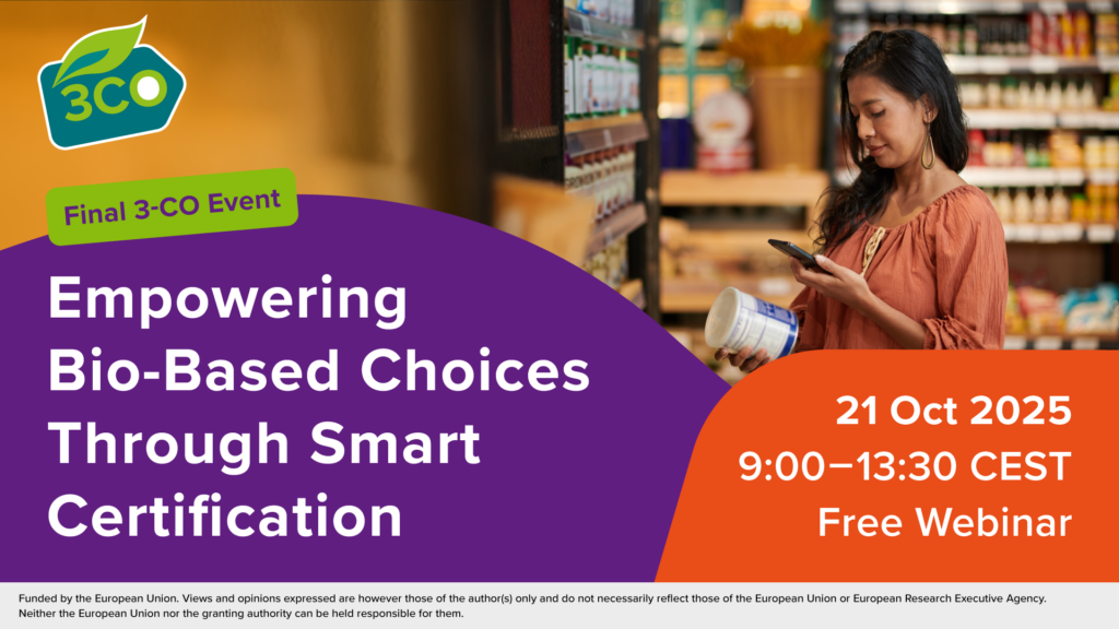 The EU-funded 3-CO project (Concise Consumer Communication through Robust Labels for Bio-based Systems) focuses on empowering consumers to make more sustainable choices by enhancing how bio-based products (BBPs) are labelled and certified. By developing actionable guidelines for label and certification scheme (LCS) owners, digital solutions to support consumer decision-making, and policy recommendations, 3-CO aims to improve the visibility, credibility, and uptake of sustainable products.
