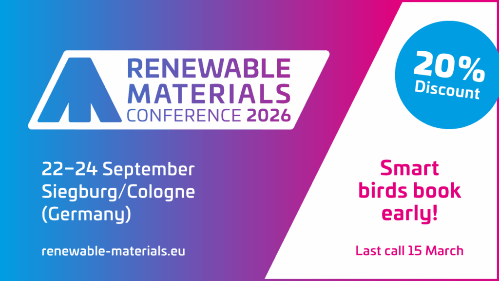 Darüber hinaus können sich Teilnehmende bereits jetzt für die Konferenz registrieren und bis zum 15. März von einem 20% Frühbucherrabatt auf das Ticket profitieren (https://renewable-materials.eu/registration/).