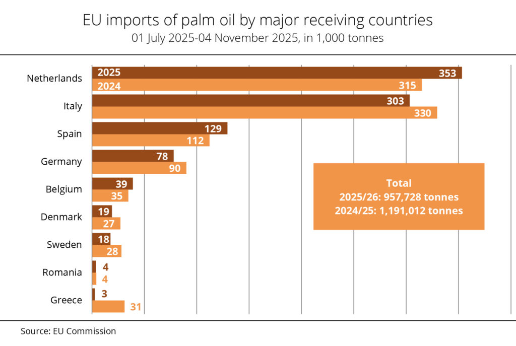 On the recipient side, the Netherlands remained the leading hub for European palm oil trading and a key location for biofuel production. At 353,000 tonnes, the country absorbed roughly 12 per cent more palm oil than in the same period the previous year. Italy took second place among importing countries, receiving 303,000 tonnes, which represents a decrease of 8 per cent. Greece recorded the sharpest decline (-91 per cent), followed by Sweden (-37 per cent) and Denmark (-30 per cent). Germany imported 78,000 tonnes, down 13 per cent year-on-year. In contrast, Belgium and Spain slightly increased their import volumes. According to research by Agrarmarkt Informations-Gesellschaft (AMI), these countries, along with the Netherlands, are among the few EU countries showing an upward import trend.