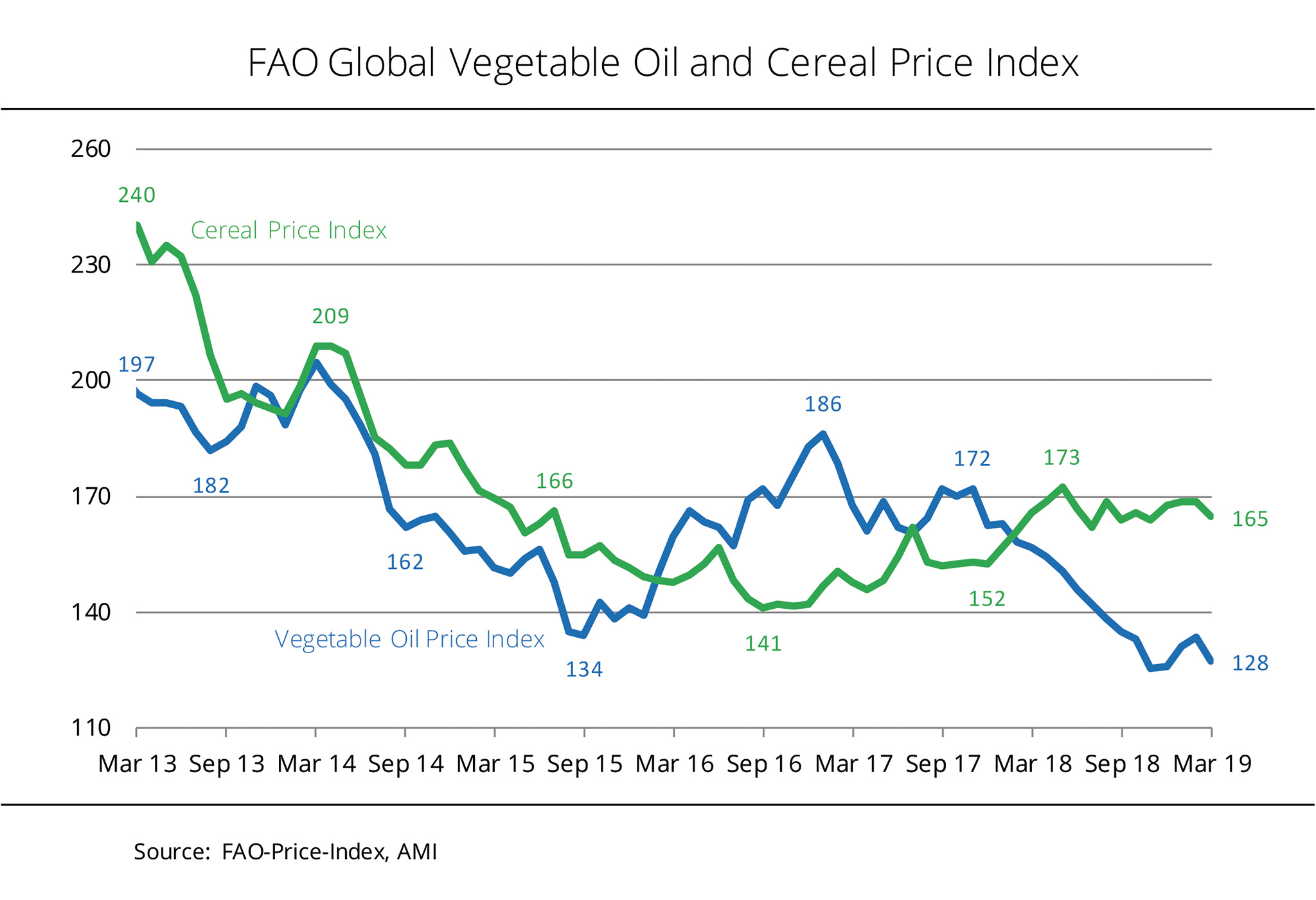The global price index for vegetable oils came under pressure in March. It slumped 4.4 per cent to 128 points, the second lowest level in eleven years. The average vegetable oil price index for 2018 as a whole was 144 points.