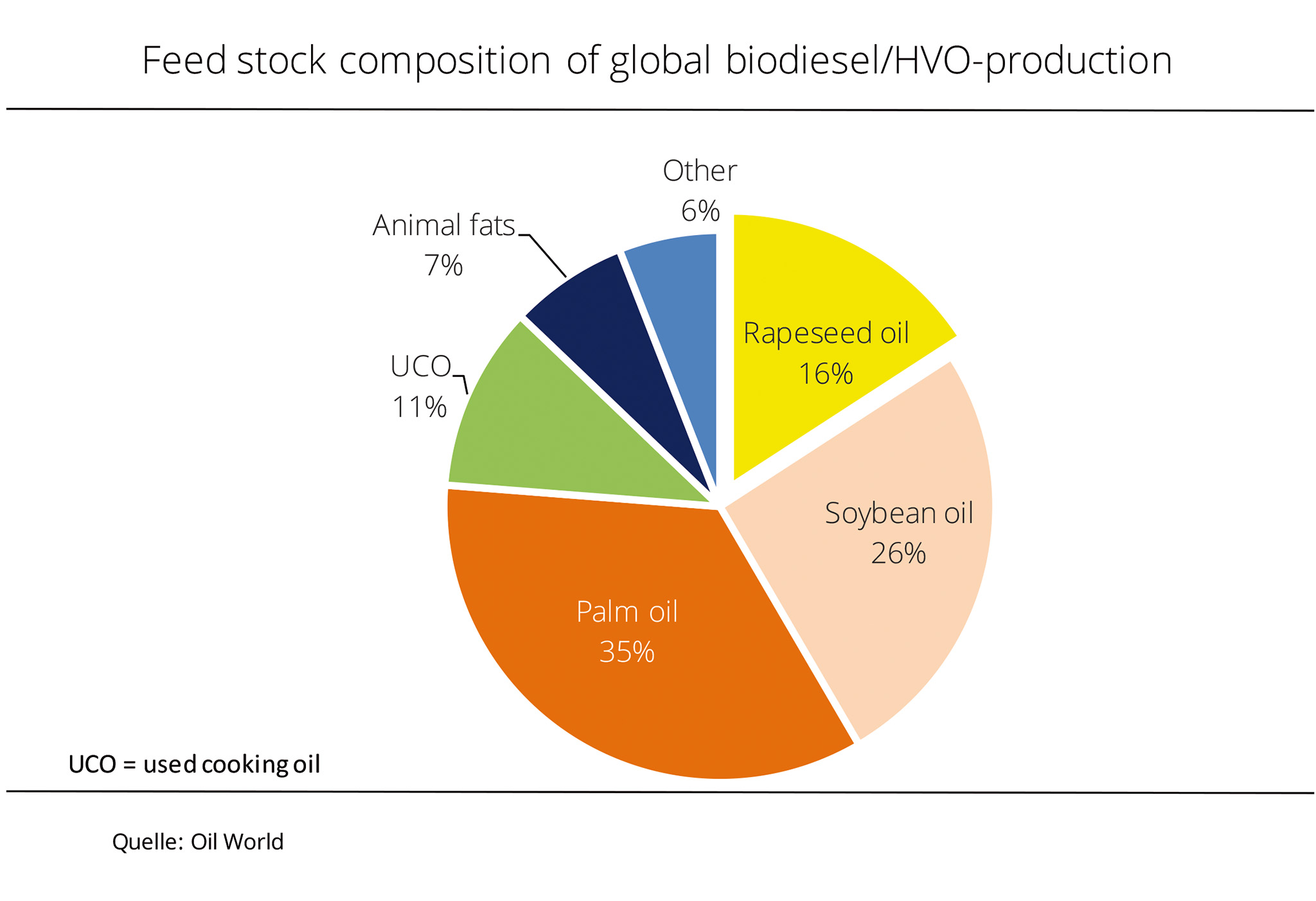 Feedstock percentages could also change in the wake of the smaller rapeseed harvest caused by drought, the transition to soybean processing and the more than EUR 300 per tonne price gap at times between palm oil and rapeseed oil.