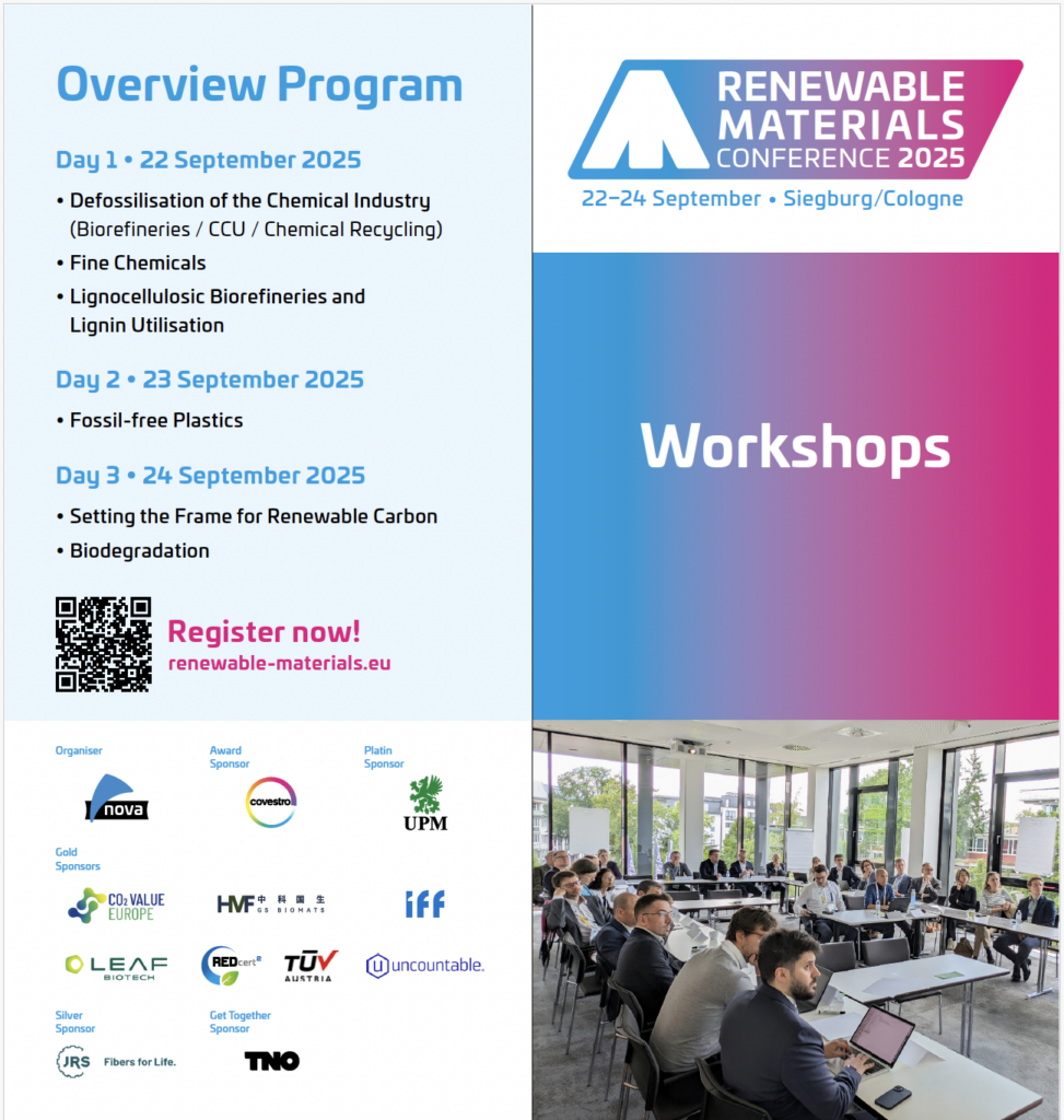 - Christopher vom Berg from RCI/nova-Institute will host an on-site workshop on 24 September (11:20-12:50) with external experts Janine van Kampen, Dutch Ministry of Climate Policy and Green Growth (NL), Sebastian Kunz, Südzucker (DE), Luciano Proto Cassina, nova-Institute (DE). Topic: Facilitating Change – Policy for a Renewable Carbon Transition