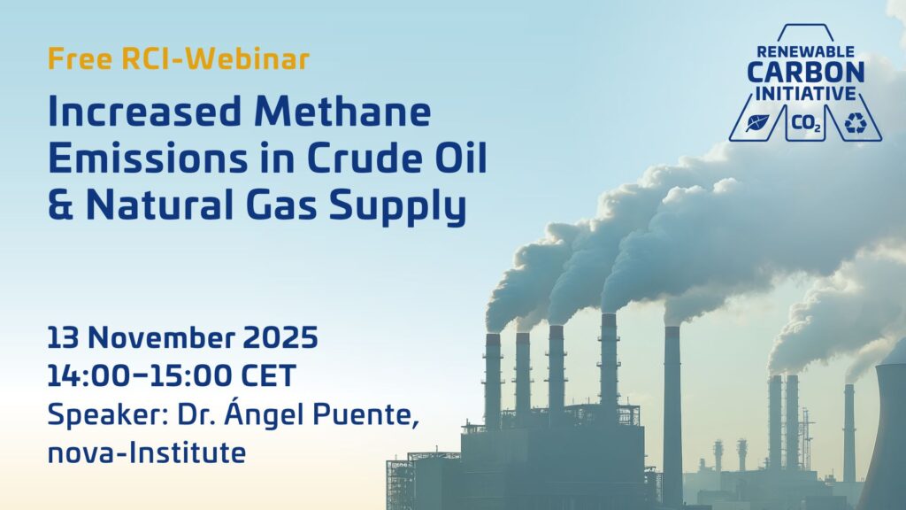 On 13 November, 96 participants registered for RCI’s free webinar on the recently released scientific RCI background report “Increased Methane Emissions in Crude Oil and Natural Gas Supply: Implications for the Carbon Footprint of Petrochemicals”. The study was presented by Ángel Puente from nova-Institute, who was primarily responsible for its development.