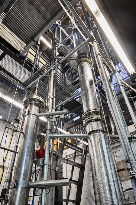 Um das 3-Caren aus dem Terpentinöl zu gewinnen, errichteten die Projektpartner am Campus Deutz eine rund acht Meter hohe Trennkolonne im Technikumsmaßstab. Alle Bestandteile wurden in der Werkstatt der TH Köln maßgefertigt.