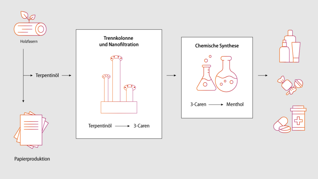„Terpentinöl entsteht während der Papierproduktion, wenn Holzfasern zerkocht werden. Allein am Hauptsitz unseres Partners UPM Kymmene sind es jährlich mehrere 10.000 Tonnen, die dann thermisch verwertet oder zu Biodiesel umgesetzt werden. Bei unseren Überlegungen zu alternativen Verwendungsmöglichkeiten haben wir uns auf die chemische Verbindung 3-Caren konzentriert, die etwa 30 Prozent des Öls ausmacht und aus der sich Menthol herstellen lässt. Eine große Herausforderung dabei ist, das Öl in seine Bestandteile aufzutrennen“, erläutert Projektleiter Prof. Dr. Matthias Eisenacher von der Fakultät für Angewandte Naturwissenschaften der TH Köln.