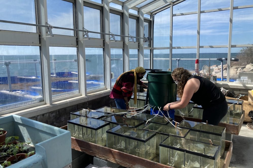 Marine sciences Ph.D. candidate Hannah Collins and Larissa Tabb ’22 evaluate the lab tanks to check on degradation progress. (Contributed by Hannah Collins)