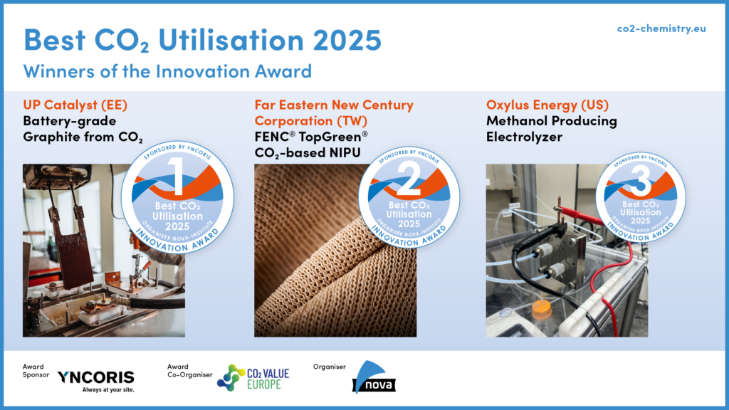 Yncoris ist Sponsor des Innovationspreises „Best CO2 Utilisation 2025“. Der etablierte Award, der gemeinsam vom nova-Institut und CO2 Value Europe organisiert wird, würdigt Pionierinnen und Pioniere im Bereich Carbon Capture and Utilisation (CCU). CO₂ Value Europe, der europäische Verband für CO2-Nutzung, bringt seine Expertise in der Förderung nachhaltiger industrieller Lösungen ein, während Yncoris als führendes Unternehmen in der Planung, im Bau und im Betrieb von Anlagen für die chemische Industrie das Engagement für nachhaltige Technologien unterstützt. Das unabhängige Forschungsinstitut nova-Institut steuert umfassende Kompetenz im Bereich der erneuerbaren Kohlenstoffkreisläufe und Nachhaltigkeit zum Award bei.