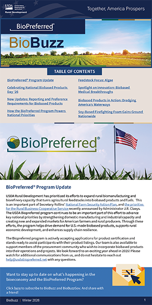 The Biopreferred Program is actively accepting applications for product certification and stands ready to assist participants with their product listings. Our team is also available to support members of the procurement community who wish to incorporate biobased products into their operations and projects. We look forward to an exciting year ahead in 2026!