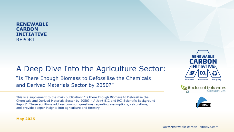 DownloadsThe webinar was presented by Michael Carus (nova-Institute, RCI), supported by Christopher vom Berg (RCI), Dirk Carrez (BIC), and Marco Rupp (BIC). It was based on a Scientific Background Report “Is there enough biomass to defossilise the chemicals and derived materials sector by 2050?” commissioned by the Bio-based Industries Consortium (BIC) and the Renewable Carbon Initiative (RCI).